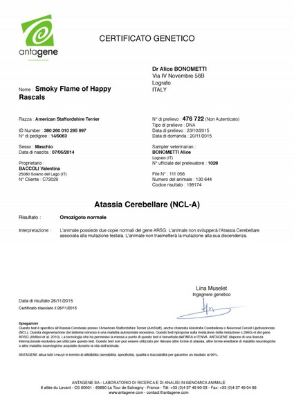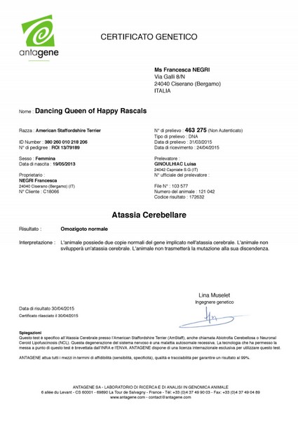 I nostri cuccioli sono garantiti omozigoti normali per parentela e consegnati con copia dei certificati Antagene dei genitori.
